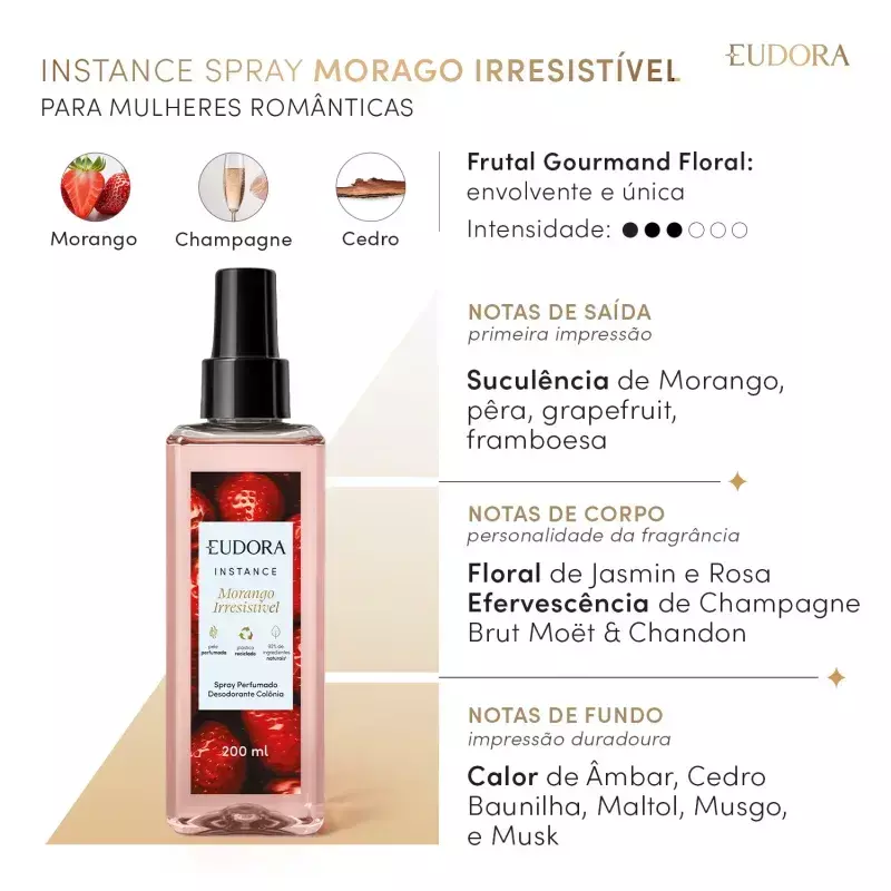 O Spray Perfumado Desodorante Colônia Instance Morango irresistível traz a base de Morangos Selvagens que revelam uma combinação natural e floral, com um toque de açúcar queimado, proporcionando uma experiência olfativa envolvente e única. Só Eudora Instance tem um morango flambado e suculento que encontra o espumante em uma alquimia perfeita.